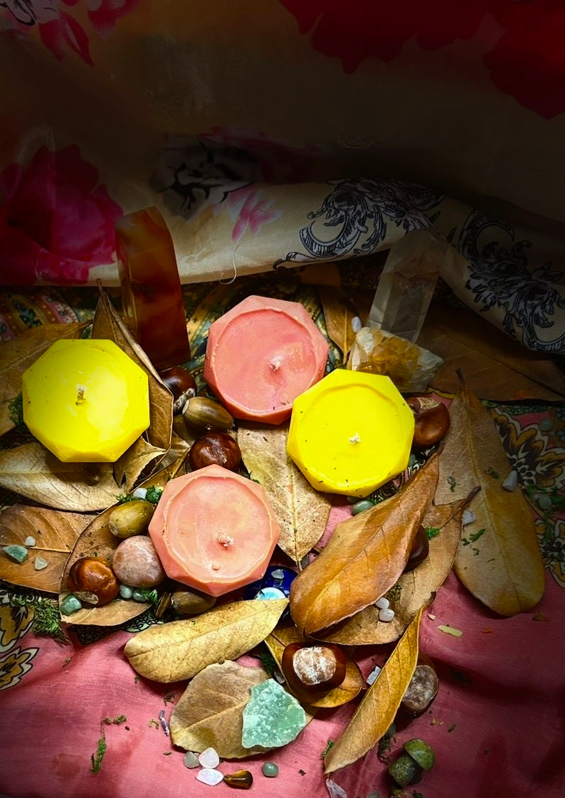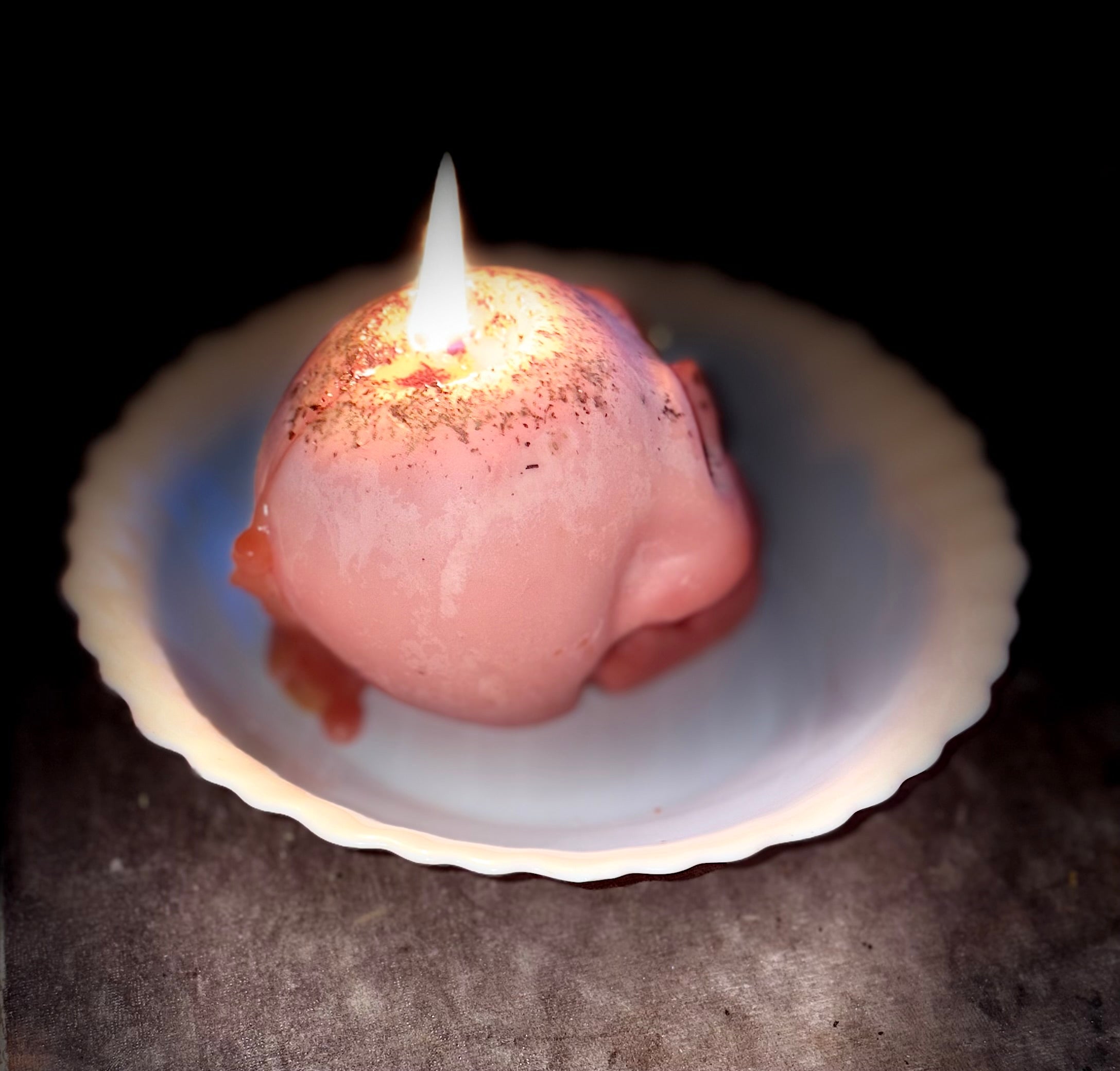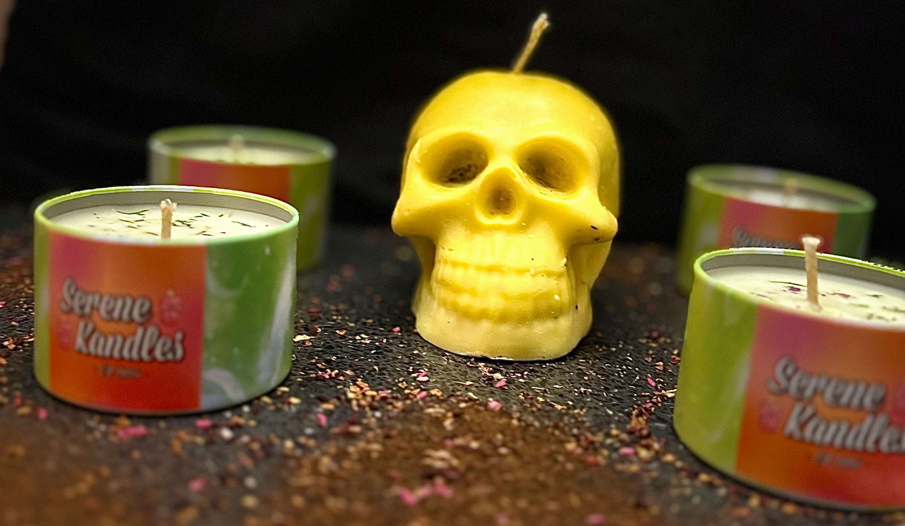 This kandle, herbal yet zesty, is a beautiful and limited edition kandle. A lot of time and wax put into them! The candles surrounding the skulls is herbal gardens, containing similar ingredients to the skull, they are available purchase today!